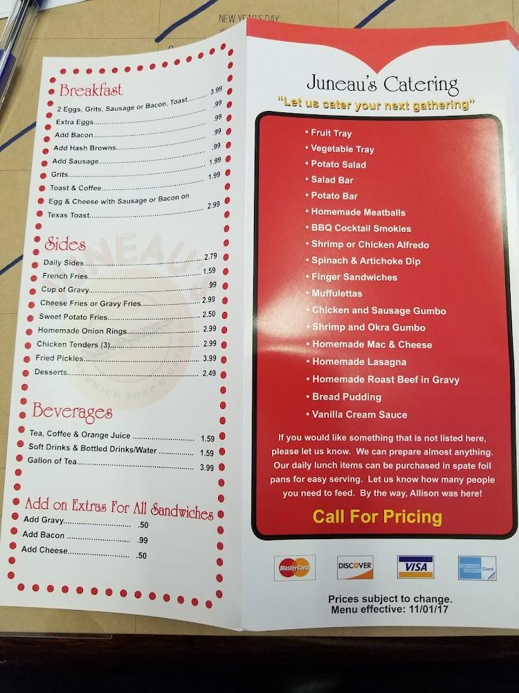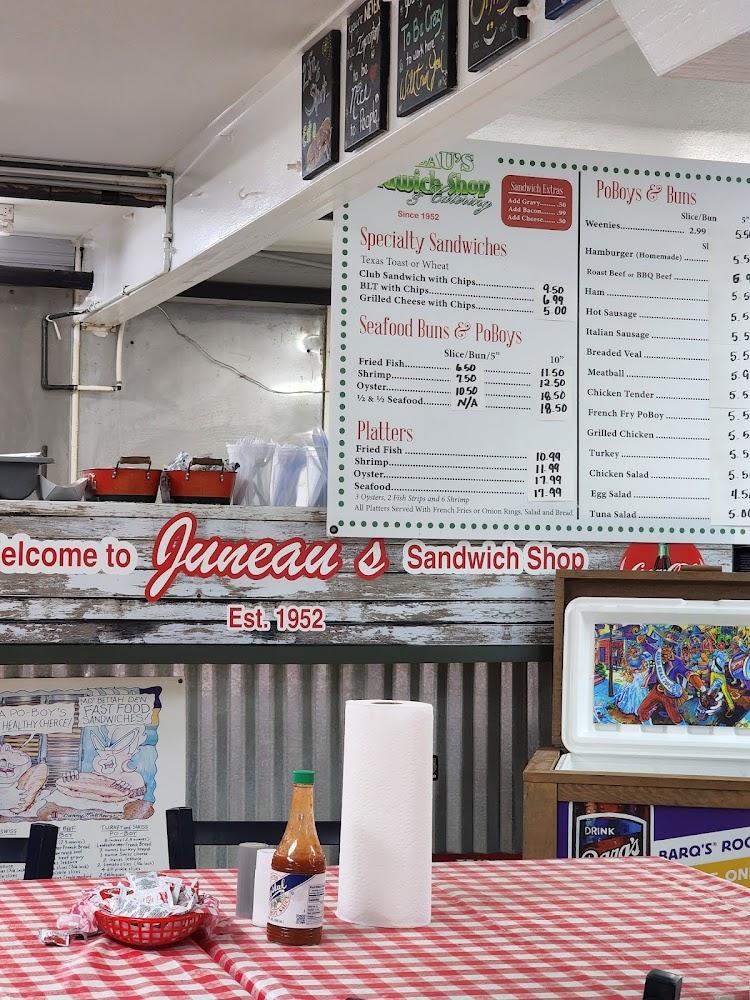 Juneau's Sandwich Shop boasts a diverse menu that highlights local cuisine. Breakfast features hearty staples, including eggs and grits, alongside delightful sandwiches. Lunch options expand with a variety of poboys and platters showcasing seafood and meats.
